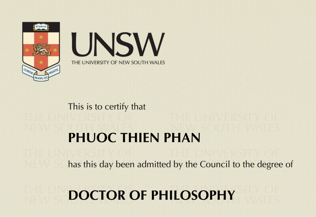 It is an honour to be awarded a PhD and a Dean’s Award for Outstanding PhD Theses by the University of New South Wales, UNSW Sydney, Australia.